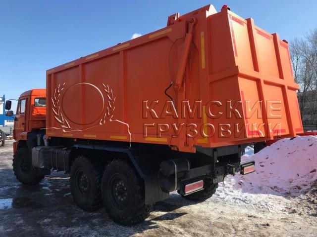 Уплотнение отходов в кузове производится толкающей плитой. Перемещение мусора по ширине кузова производится разравнивателем. Выгрузка осуществляется опрокидыванием кузова и толкающей плитой.